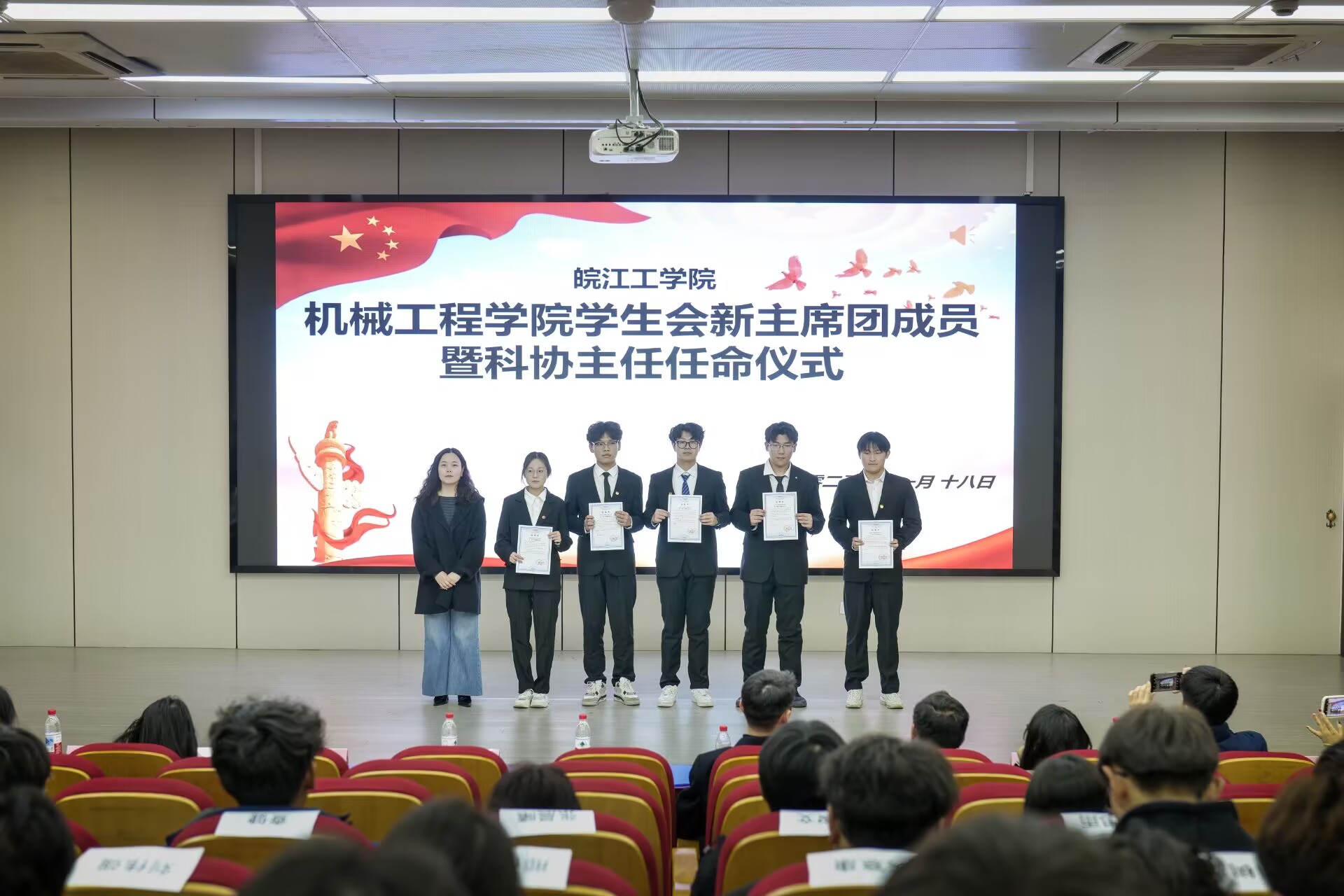 随后,主持人宣读了第十一届学生会主席团成员及科协新一届负责人任命名单,领导老师为上一届优秀学生干部颁发荣誉证书,为上一届主席团授予聘书,见证责任与使命的交接。