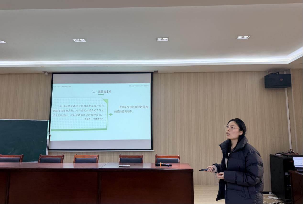 会上,石贵敏老师重点剖析了“社会主义核心价值观“的核心要素和基本内容,并将“社会主义核心价值观”的实践要求与大学生日常行为(如诚信考试、志愿服务)相结合,避免了空泛说教,有机融入教学目标于课堂讲授之中。马书情老师通过解读马克思主义原著内容,并结合近期社会热点事件,分享了教材第五章“遵守道德规范 锤炼道德品格”的课堂教学,强调通过鲜活案例引导学生深刻理解新时代青年的历史使命。
